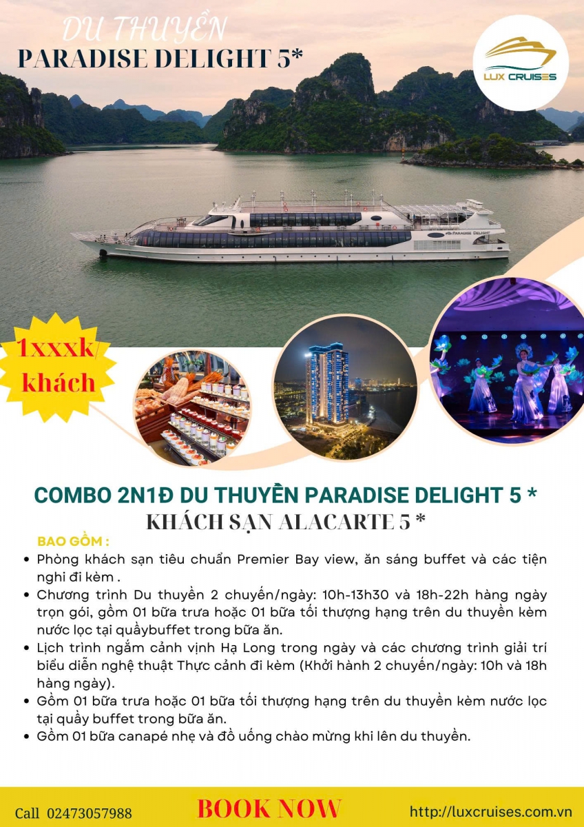 Combo 2N1D du thuyền Paradise Delight 5* khách sạn Alacarter 5*