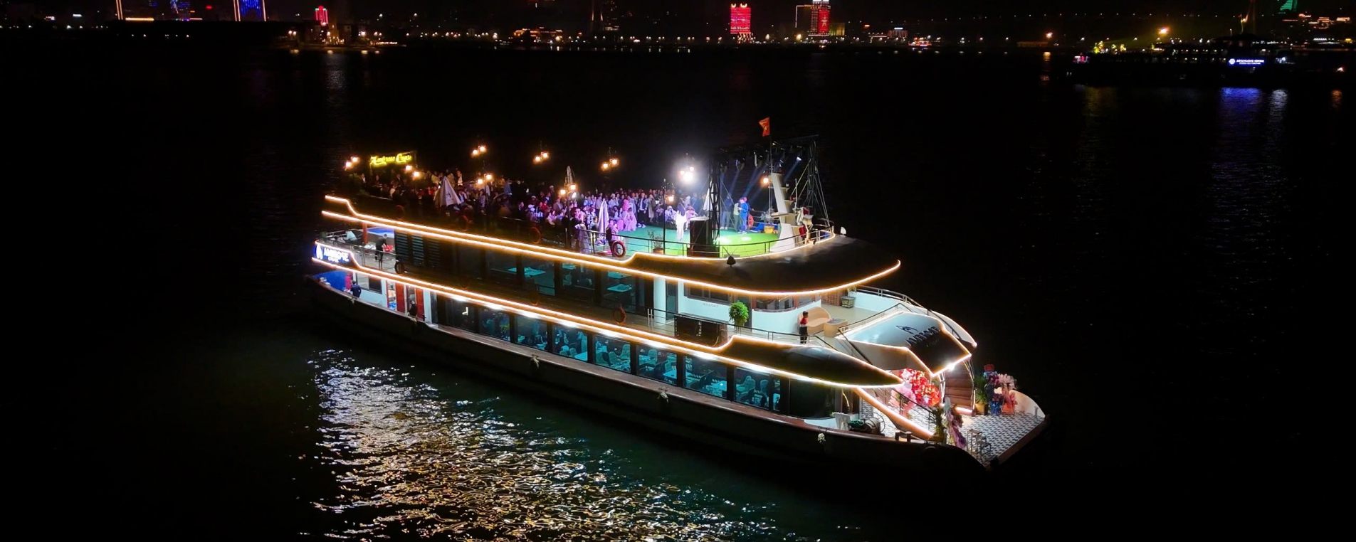 Không gian bên trong được thiết kế với sự tinh tế và tỉ mỉ đến từng chi tiết. Khu vực nhà hàng trên du thuyền toát lên vẻ sang trọng với hệ thống ánh sáng vàng, tạo cảm giác dễ chịu . Sàn lát gạch hoa văn đen trắng cổ điển kết hợp hài hòa với trần gỗ ốp không gian rộng rãi. Không gian này không chỉ là nơi nghỉ ngơi mà còn là một “background” hoàn hảo để lưu giữ những khoảnh khắc đẹp.