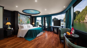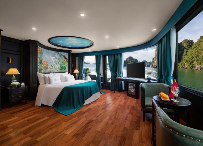 bữa trưa tại nhà hàng sang trọng trên tàu trong khi du thuyền di chuyển khám phá trên Vịnh