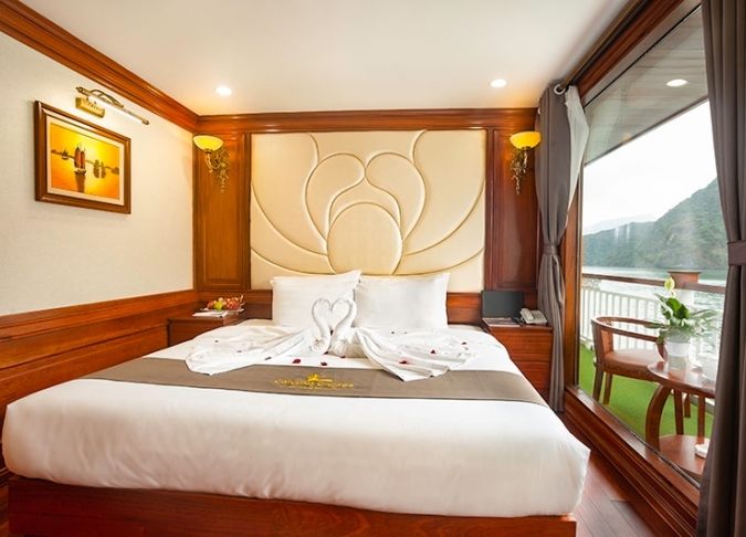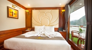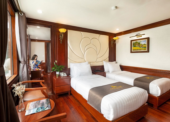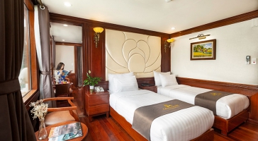 Mỗi du thuyền bao gồm 20 cabins sang trọng và rông rãi, được thiết kế theo phong cách cổ điển Phương Đông. Tất cả nội thất trong phòng đều được làm từ gỗ cao cấp, với gam mầu nâu trầm tạo nên sự ấm cúng, gần gũi với thiên nhiên. Trong phòng được trang bị đầy đủ tiện nghi hiện đại với phòng tắm riêng, có bồn sục cao cấp và cửa sổ lớn phóng tầm nhìn tuyệt đẹp ra vịnh.