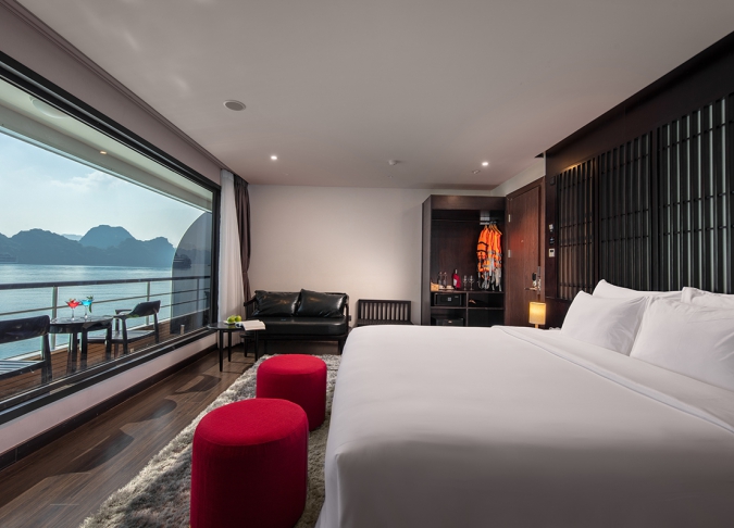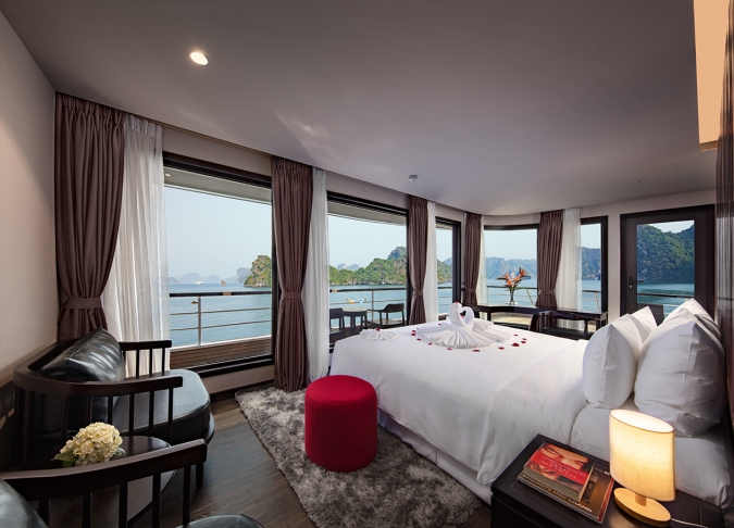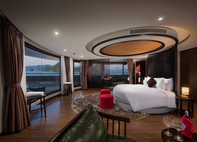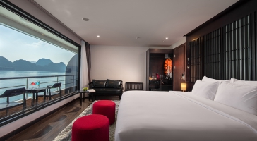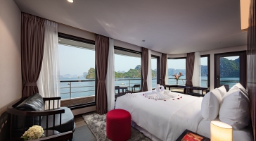 Trải nghiệm đẳng cấp sang trọng với 150m2 lộng lẫy nằm ngay phía trước boong 2 của tàu, và tận hưởng tầm nhìn 180 độ tuyệt đẹp từ trong nhà. Điểm nhấn của phòng Scarlet Pearl là boong tắm nắng ngoài trời rộng 80m2, nơi bạn có thể đắm mình trong ánh nắng, tổ chức những sự kiện đặc biệt, hoặc đơn giản là tận hưởng bầu không khí quyến rũ của vịnh với không khí trong lành và sự riêng tư.