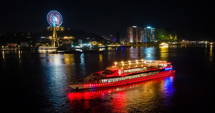 18:00 – 18:15 Quý khách sẽ có thời gian ngắm nhìn khung cảnh lung linh tuyệt đẹp của thành phố Hạ Long về đêm trong khi du thuyền Sea Octopus di chuyển trong vịnh, đưa quý khách đi qua những địa điểm nổi tiếng như cầu Bãi Cháy, Vòng quay mặt trời, núi Bài Thơ, Quảng Trường, bảo tàng Quảng Ninh, cung Cá Heo.