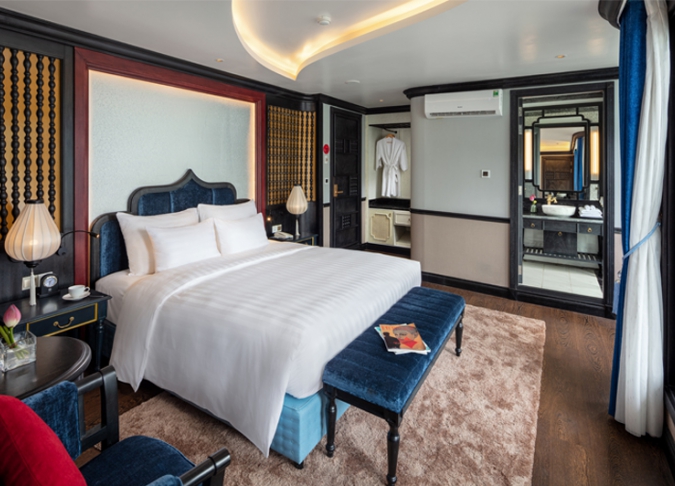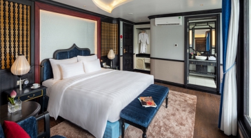 12:30 – 13:00 Quý khách lên tàu, thưởng thức đồ uống chào mừng trong lúc Quản lý tàu phổ biến hành trình và các thông tin quan trọng trong chuyến đi, hướng dẫn an toàn, sau đó làm thủ tục nhận phòng.