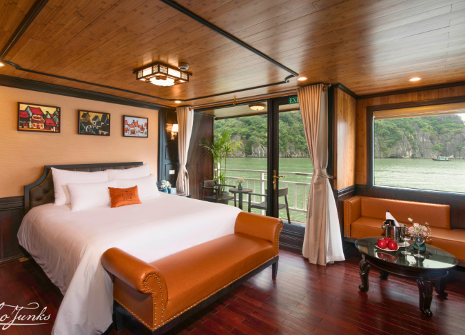 Các phòng nghỉ của du thuyền được trang bị đầy đủ tiện nghi, với ban công riêng, phòng tắm riêng không khác gì các khách sạn hạng sang. Với một căn phòng hướng vịnh bạn sẽ hoàn toàn được thoải mái nghỉ ngơi một cách riêng tư trong căn phòng của mình.
